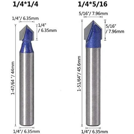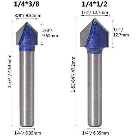 - Set de 4 fraises à rainurer en forme V de haute qualité, disponibles en tailles 6.35mm, 7.94mm, 9.52mm et 12.7mm. Parfait pour les travaux de menuiserie et de découpe du bois.