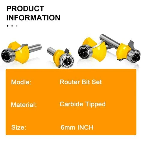 FORFAIT COMPREND: Ensemble de mèches de toupie1, bords arrondis, au-dessus de la tige,Remarque: évitez de couper du métal ferreux et des matériaux autres que le bois, tels que l’acier, le fer